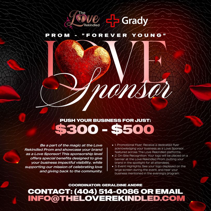 Be a part of the magic at the Love Rekindled Prom and showcase your brand as a Love Sponsor! This sponsorship level offers special benefits designed to give your business impactful visibility, while supporting our mission of celebrating love and giving back to the community.